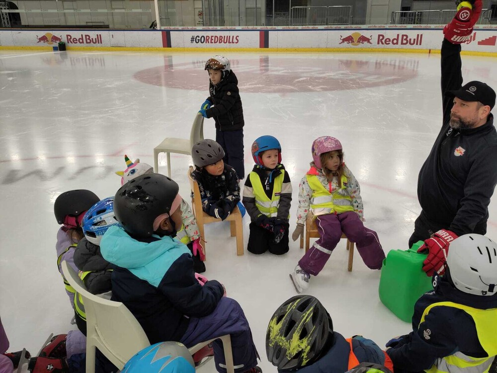Das war ein Spaß! Viele Kinder aus der Klasse standen zum ersten Mal auf dem Eis. So waren die ersten Schritte in den ungewohnten Schlittschuhen ganz schön wacklig. Fast jedes Kind fiel mal hin, aber zum Glück waren alle gut gepolstert. Alle lernten schnell dazu und am Ende schaffte jedes Kind ein paar Meter auf dem Eis. Der Trainer zeigte uns verschiedene Übungen. Am Ende durften wir sogar Hockey spielen. Wir freuen uns schon auf den nächsten Besuch in der Eishalle!
